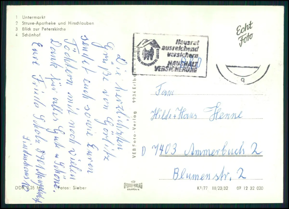 Gelaufen, sauber beschriftet, postalischer Eindruck aus der DDR-Zeit. Druckvermerk VEB Foto-Verlag sowie Bildhinweise zu den vier Motiven. Papier fest und intakt.
