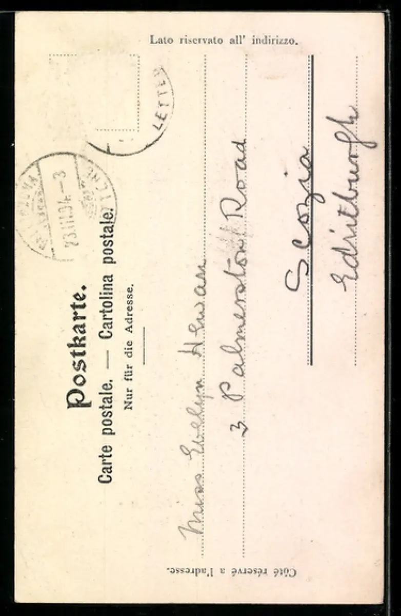 alte Ansichtskarte, gelaufen, Briefmarke entfernt, rückseitig Oberflächenschaden, guter Zustand