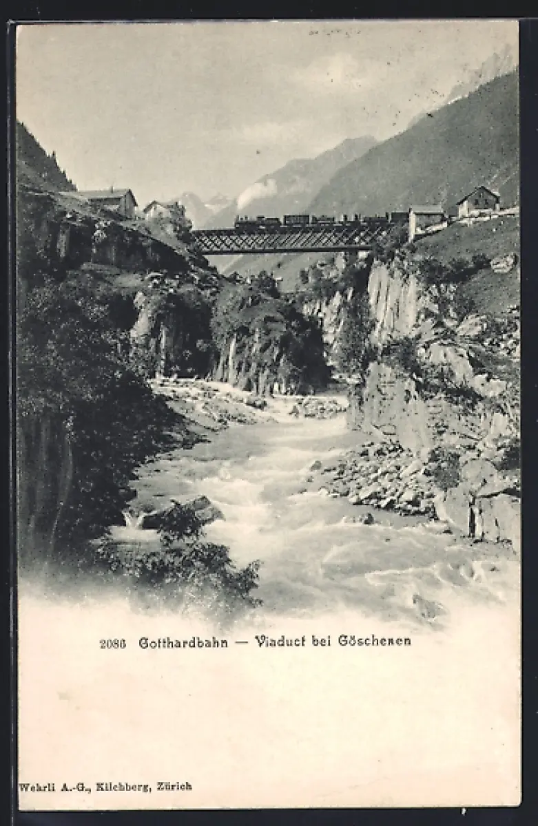 AK Göschenen, Viaduct der Gotthardbahn mit Güterzug