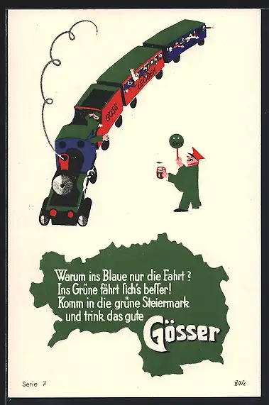 AK Göss b. Leoben, Brauerei-Werbung für Gösser Bier, Gösser Eisenbahn