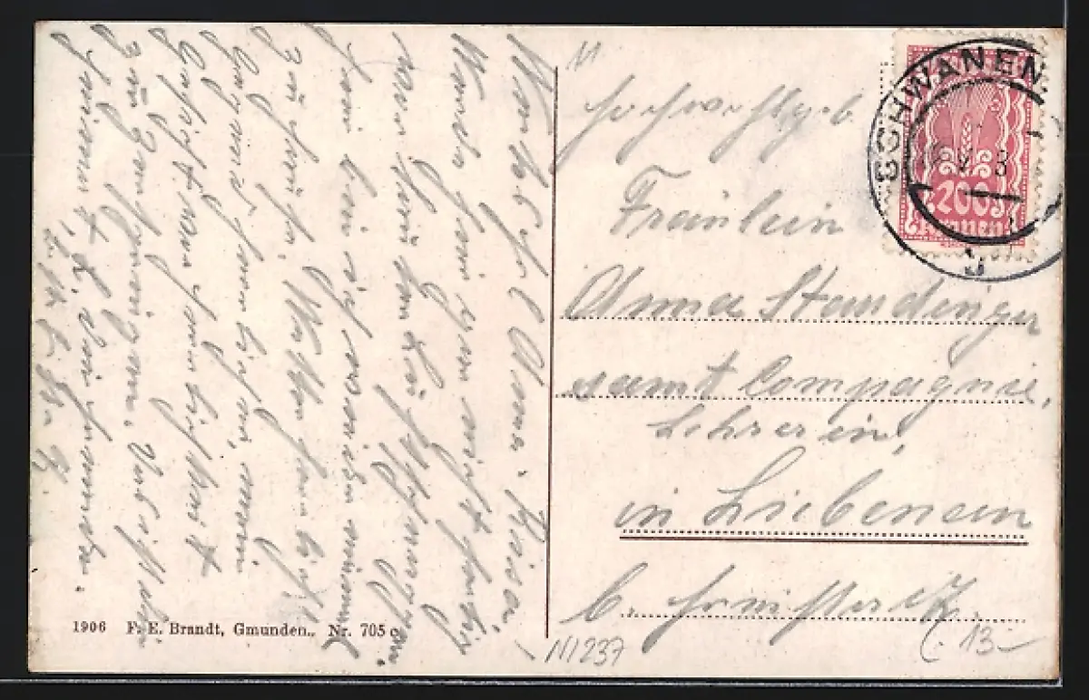 Personenbezogene Daten auf der Rückseite der Karte wurden durch blauen Textmarker unkenntlich gemacht. Die blauen Stellen sind auf die Vorderseite durchgeweicht und wirken sich negativ auf das Postkartenfoto aus