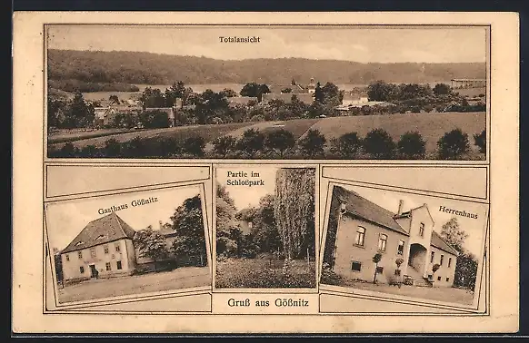 AK Gössnitz / Naumburg, Gasthaus Gössnitz, Schlosspark, Herrenhaus, Totalansicht
