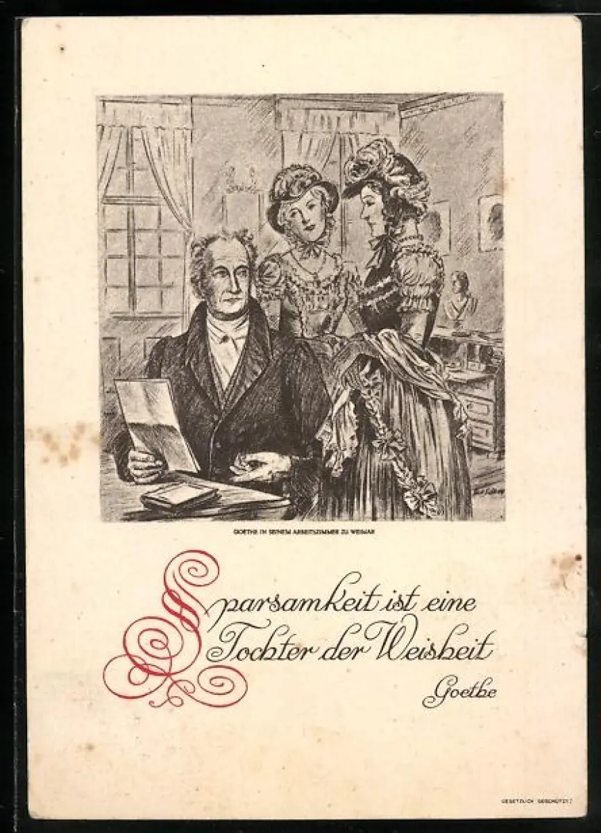 AK Goethe, Portrait mit zwei jungen Damen