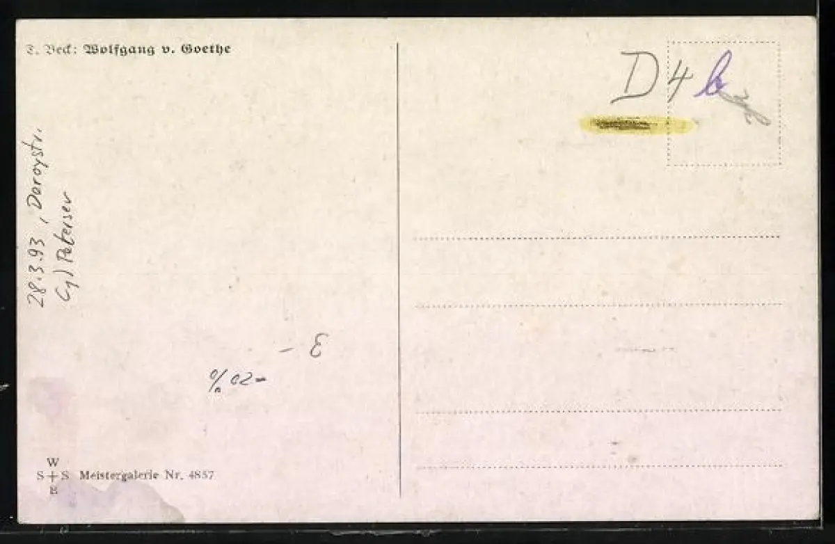 Personenbezogene Daten auf der Rückseite der Karte wurden durch blauen Textmarker unkenntlich gemacht. Die blauen Stellen sind auf die Vorderseite durchgeweicht und wirken sich negativ auf das Postkartenfoto aus