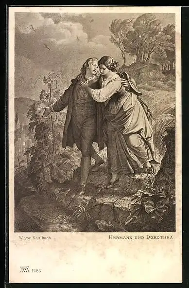 AK Goethes Hermann und Dorothea in Umarmung eine Treppe heruntersteigend