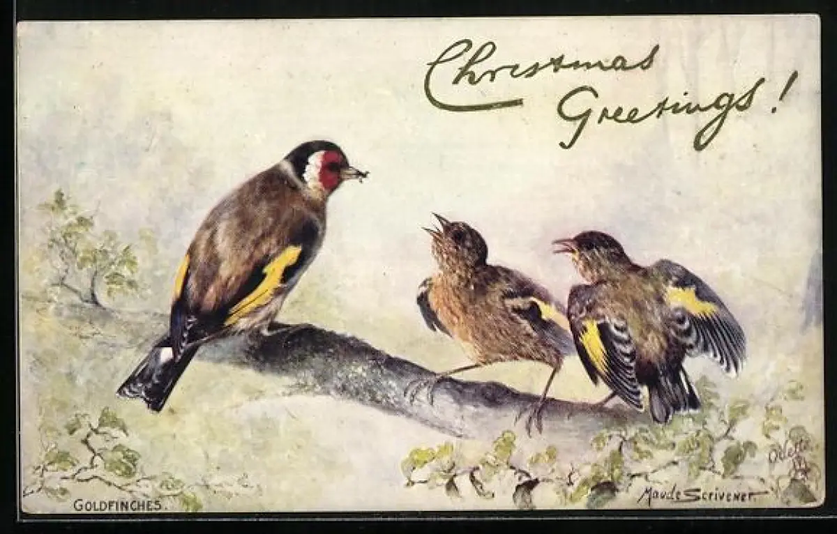 AK Goldfinkweibchen bringt Jungen Futter, Weihnachtsgruss