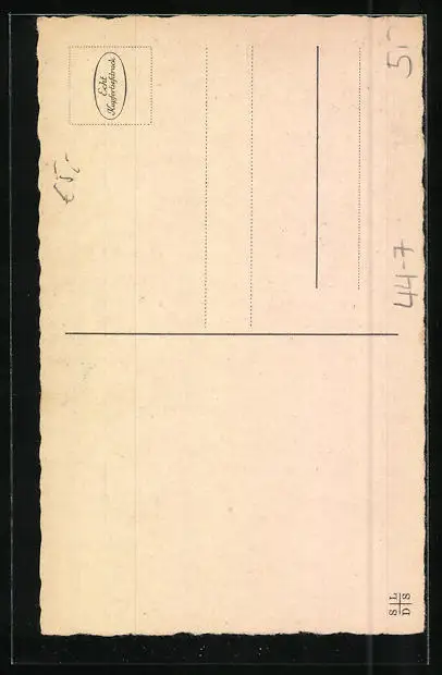 Personenbezogene Daten auf der Rückseite der Karte wurden durch blauen Textmarker unkenntlich gemacht. Die blauen Stellen sind auf die Vorderseite durchgeweicht und wirken sich negativ auf das Postkartenfoto aus