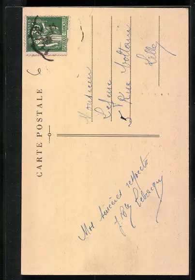 Personenbezogene Daten auf der Rückseite der Karte wurden durch blauen Textmarker unkenntlich gemacht. Die blauen Stellen sind auf die Vorderseite durchgeweicht und wirken sich negativ auf das Postkartenfoto aus