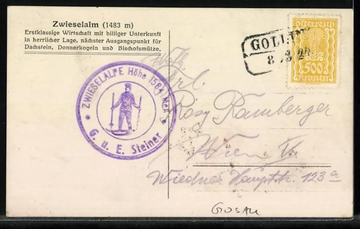 AK Gosau, Gasthaus Zwieselalm G. u. E. Steiner, Dachstein, Bischofmütze