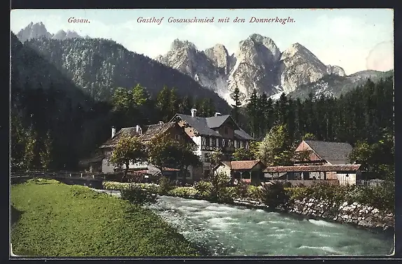 AK Gosau / Salzkammergut, Gasthof Gosauschmied mit den Donnerkogln