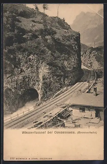 AK Gossensass, Wassertunnel und Gebäude an der Brennerbahn