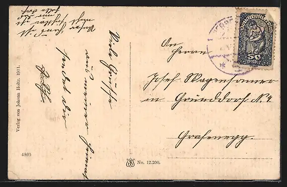 Personenbezogene Daten auf der Rückseite der Karte wurden durch blauen Textmarker unkenntlich gemacht. Die blauen Stellen sind auf die Vorderseite durchgeweicht und wirken sich negativ auf das Postkartenfoto aus