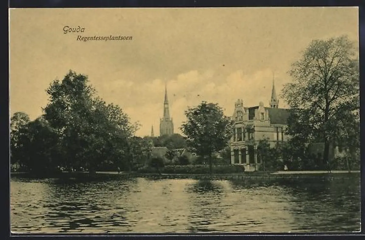 AK Gouda, Regentesseplantsoen, Partie am Wasser, Blick zum Kirchturm