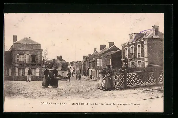 AK Gournay-en-Bray, Entrée de la Rue de Ferrières, le passage à Niveau