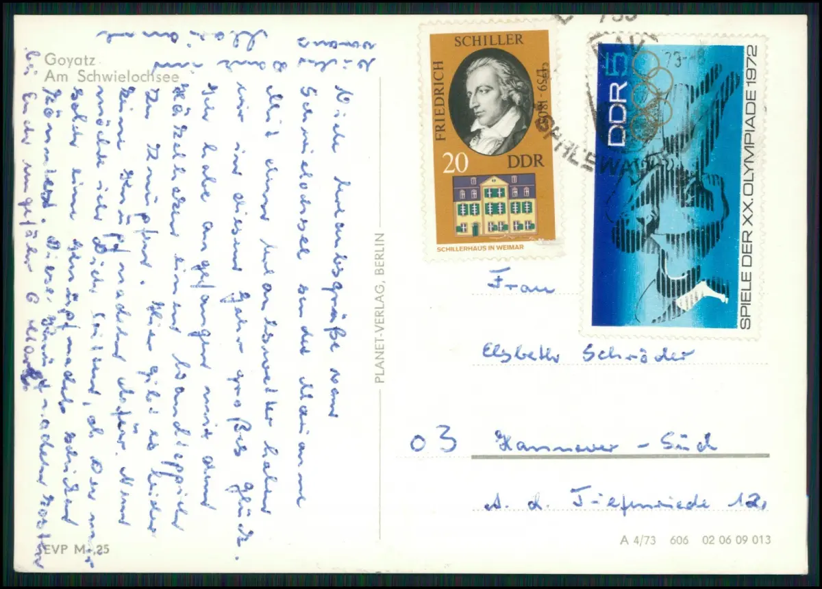 Rückseite: Beschrieben, mit DDR-Briefmarken (20 Pf Schiller / 10 Pf Olympiade 1972)