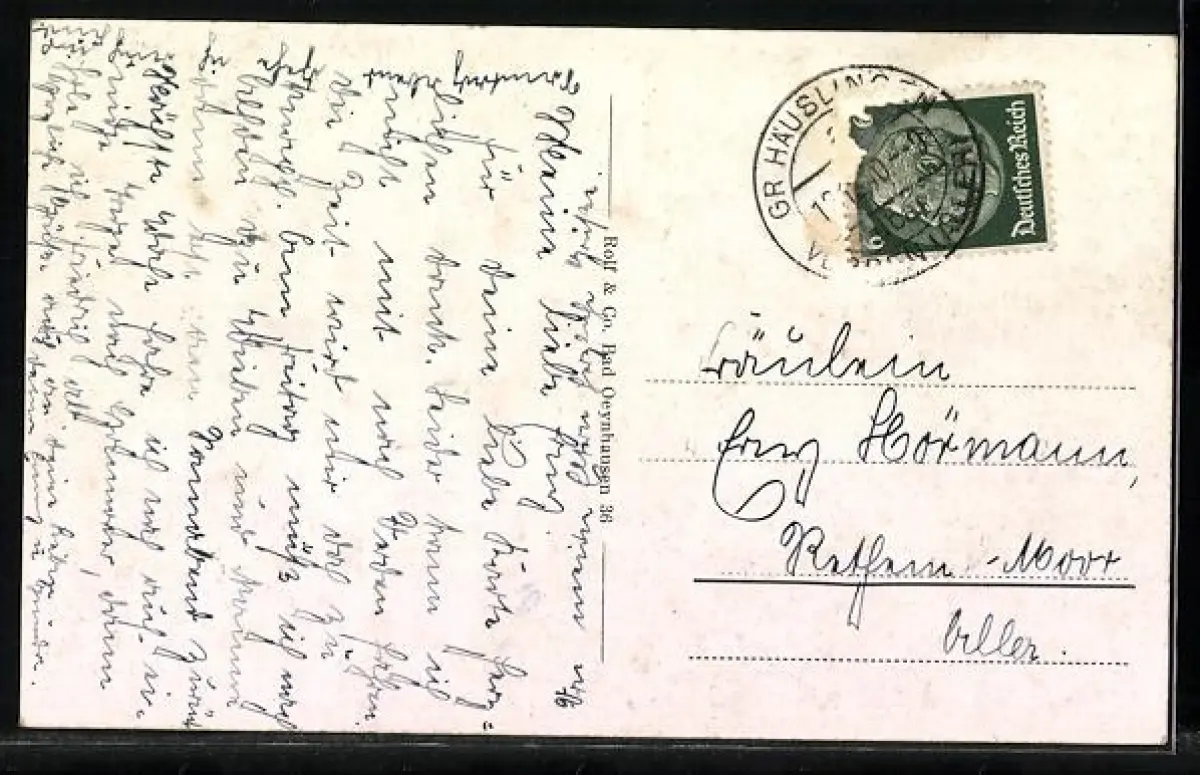 Personenbezogene Daten auf der Rückseite der Karte wurden durch blauen Textmarker unkenntlich gemacht. Die blauen Stellen sind auf die Vorderseite durchgeweicht und wirken sich negativ auf das Postkartenfoto aus