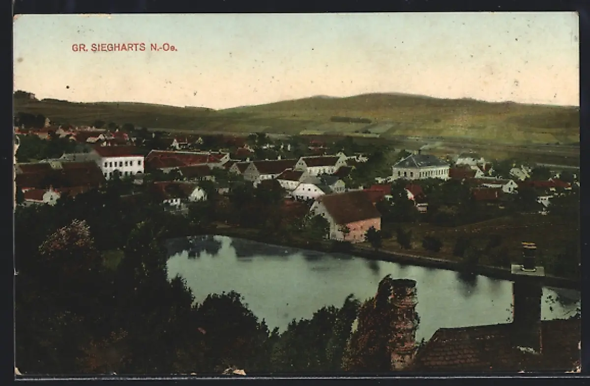 AK Gr. Siegharts /N.-Ö., Totalansicht mit Gewässer aus der Vogelschau