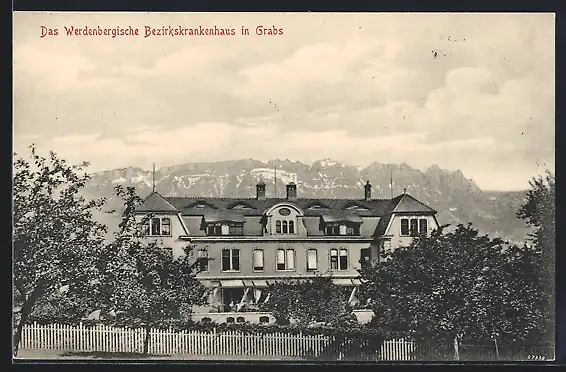 AK Grabs, Werdenbergisches Bezirgskrankenhaus mit Gipfelpanorama aus der Vogelschau