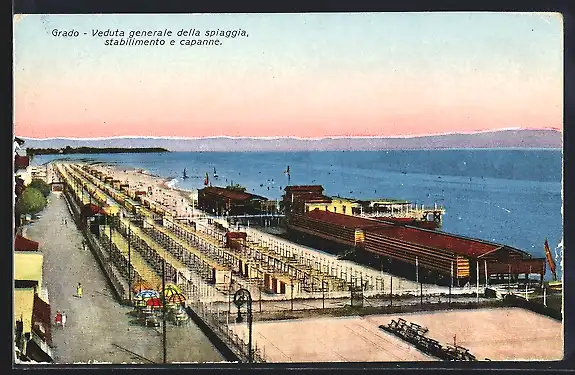 AK Grado, Vedute generale della spiaggia, stabilimento e capanne, Badeanstalt am Meer