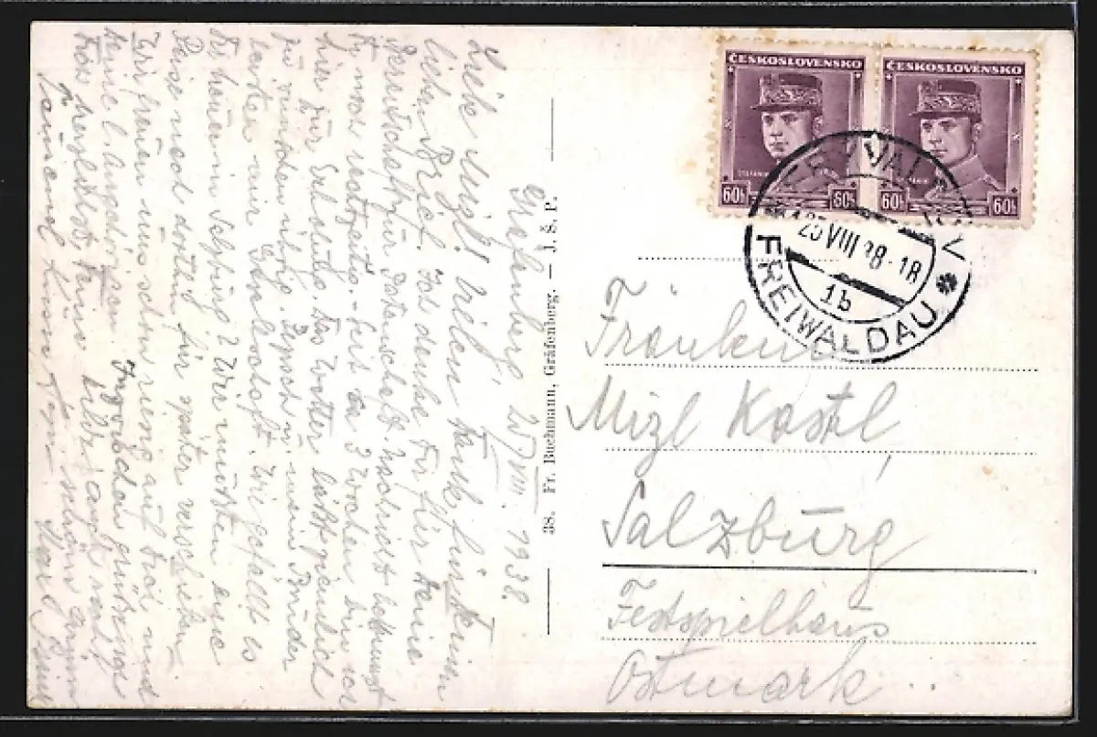 Personenbezogene Daten auf der Rückseite der Karte wurden durch blauen Textmarker unkenntlich gemacht. Die blauen Stellen sind auf die Vorderseite durchgeweicht und wirken sich negativ auf das Postkartenfoto aus