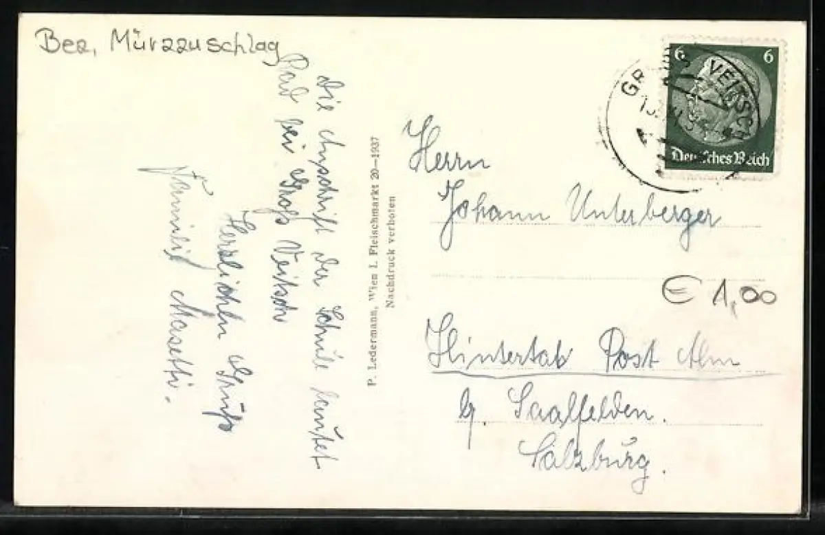 Personenbezogene Daten auf der Rückseite der Karte wurden durch blauen Textmarker unkenntlich gemacht. Die blauen Stellen sind auf die Vorderseite durchgeweicht und wirken sich negativ auf das Postkartenfoto aus
