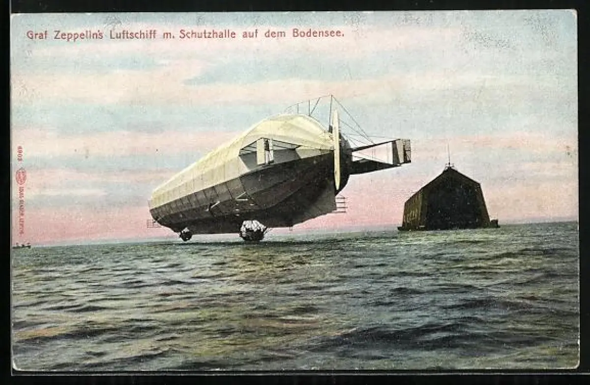AK Graf Zeppelin`s Luftschiff mit Schutzhalle auf dem Bodensee
