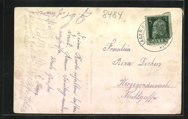 Personenbezogene Daten auf der Rückseite der Karte wurden durch blauen Textmarker unkenntlich gemacht. Die blauen Stellen sind auf die Vorderseite durchgeweicht und wirken sich negativ auf das Postkartenfoto aus