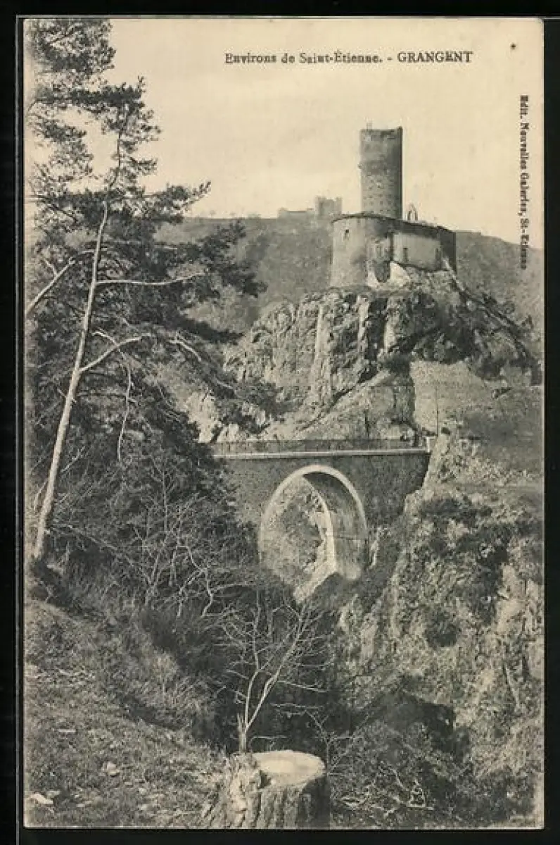 AK Grangent, Vue du château surplombant le pont et la gorge rocheuse