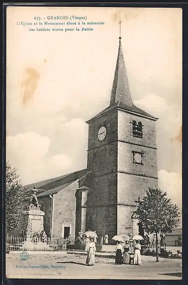 AK Granges /Vosges, L`Église et le Monument élevé à la mémoire des Soldats morts pour la Patrie