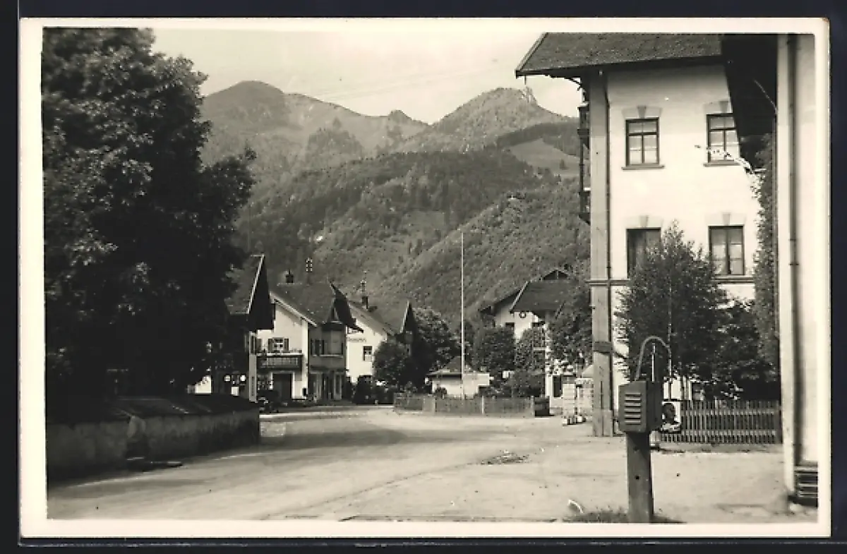 AK Grassau / Chiemgau, Partie im Ort mit Blick zu den Bergen