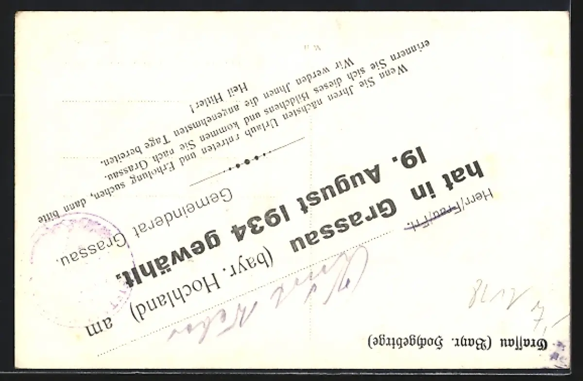 Personenbezogene Daten auf der Rückseite der Karte wurden durch blauen Textmarker unkenntlich gemacht. Die blauen Stellen sind auf die Vorderseite durchgeweicht und wirken sich negativ auf das Postkartenfoto aus