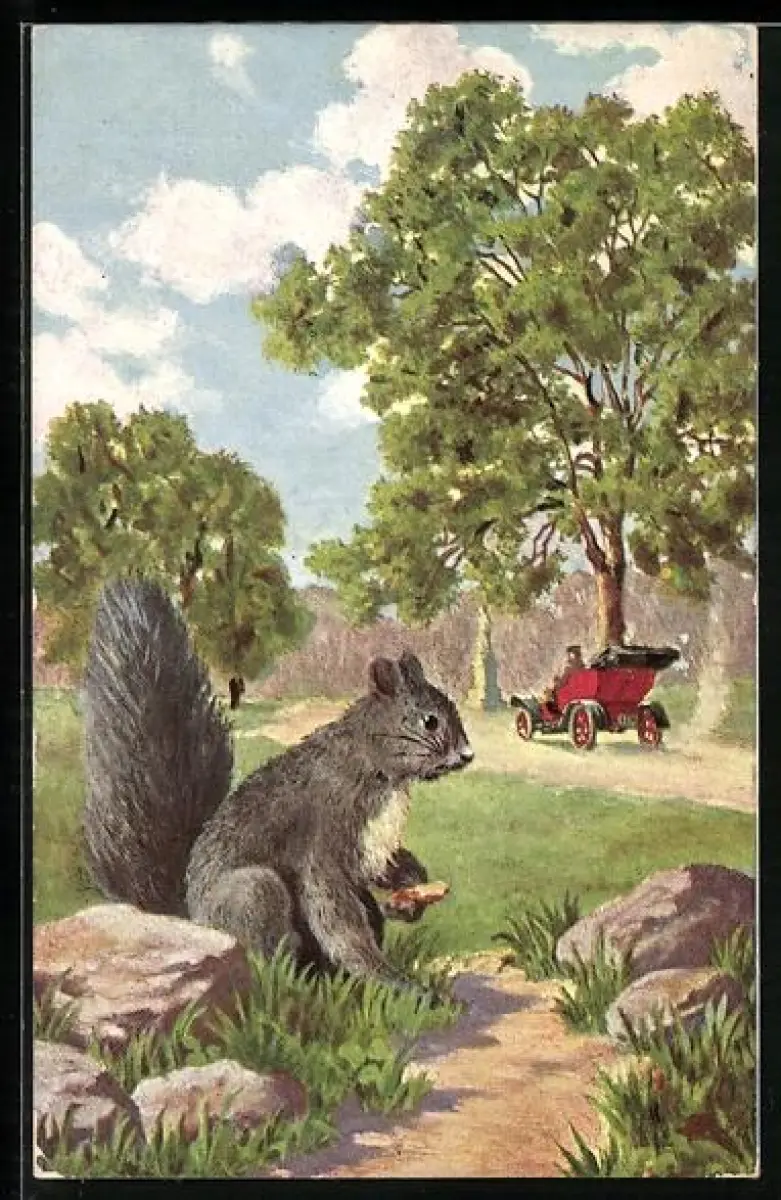 AK Graues Eichhörnchen mit Nuss neben einer Strasse, Automobil