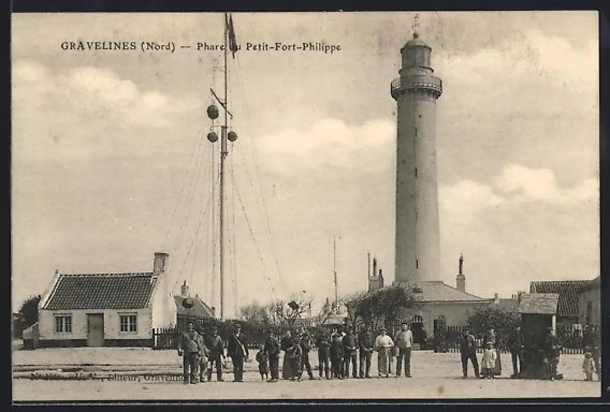AK Gravelines /Nord, Phare du Petit-Fort-Philippe et groupe de personnes devant le phare