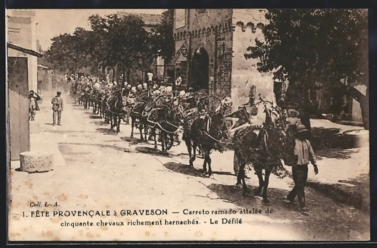 AK Graveson, Fête Provencale, Carreto ramado attelée de cinquante chevaux richement harnachés, Le Défilé
