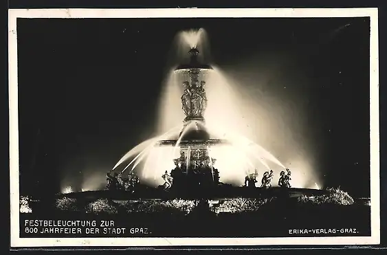 AK Graz, Festbeleuchtung des Brunnens zur 800 Jahrfeier der Stadt Graz