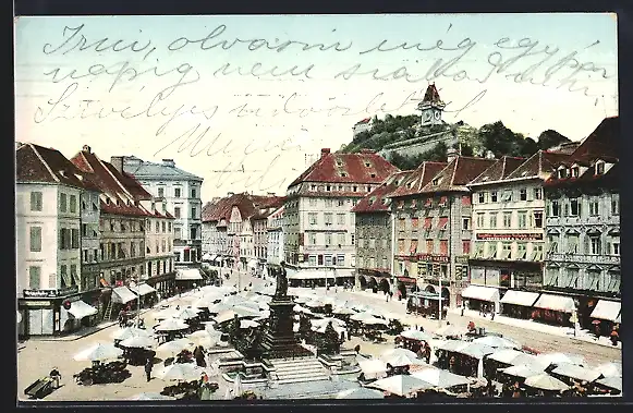 AK Graz, Hauptplatz mit Geschäften und Denkmal