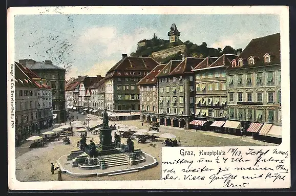 AK Graz, Hauptplatz mit Geschäften und Denkmal