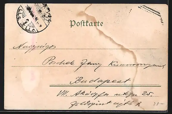 alte Ansichtskarte, gelaufen, Briefmarke entfernt, rückseitig Oberflächenschaden, Stempelspur, guter Zustand