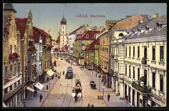 AK Graz, Marktplatz mit Geschäften und Strassenbahn