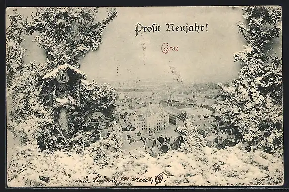 AK Graz, Ortsansicht vom verschneiten Berg aus