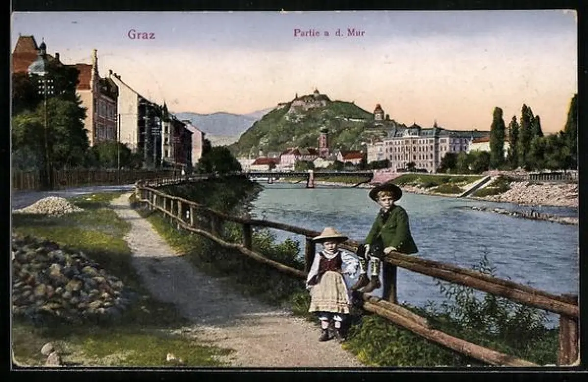 AK Graz, Partie an der Mur mit Murbrücke, Schloss und Kindern