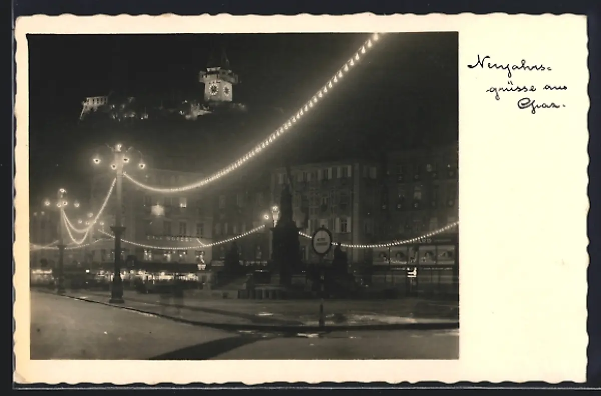 AK Graz, Platz mit Festbeleuchtung, mit Schlossberg, Neujahrsgruss