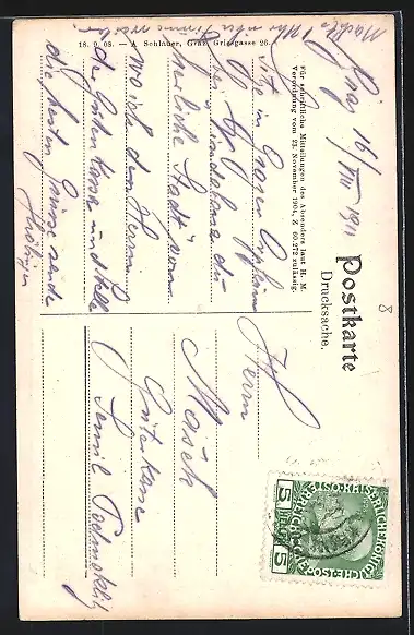 Personenbezogene Daten auf der Rückseite der Karte wurden durch blauen Textmarker unkenntlich gemacht. Die blauen Stellen sind auf die Vorderseite durchgeweicht und wirken sich negativ auf das Postkartenfoto aus