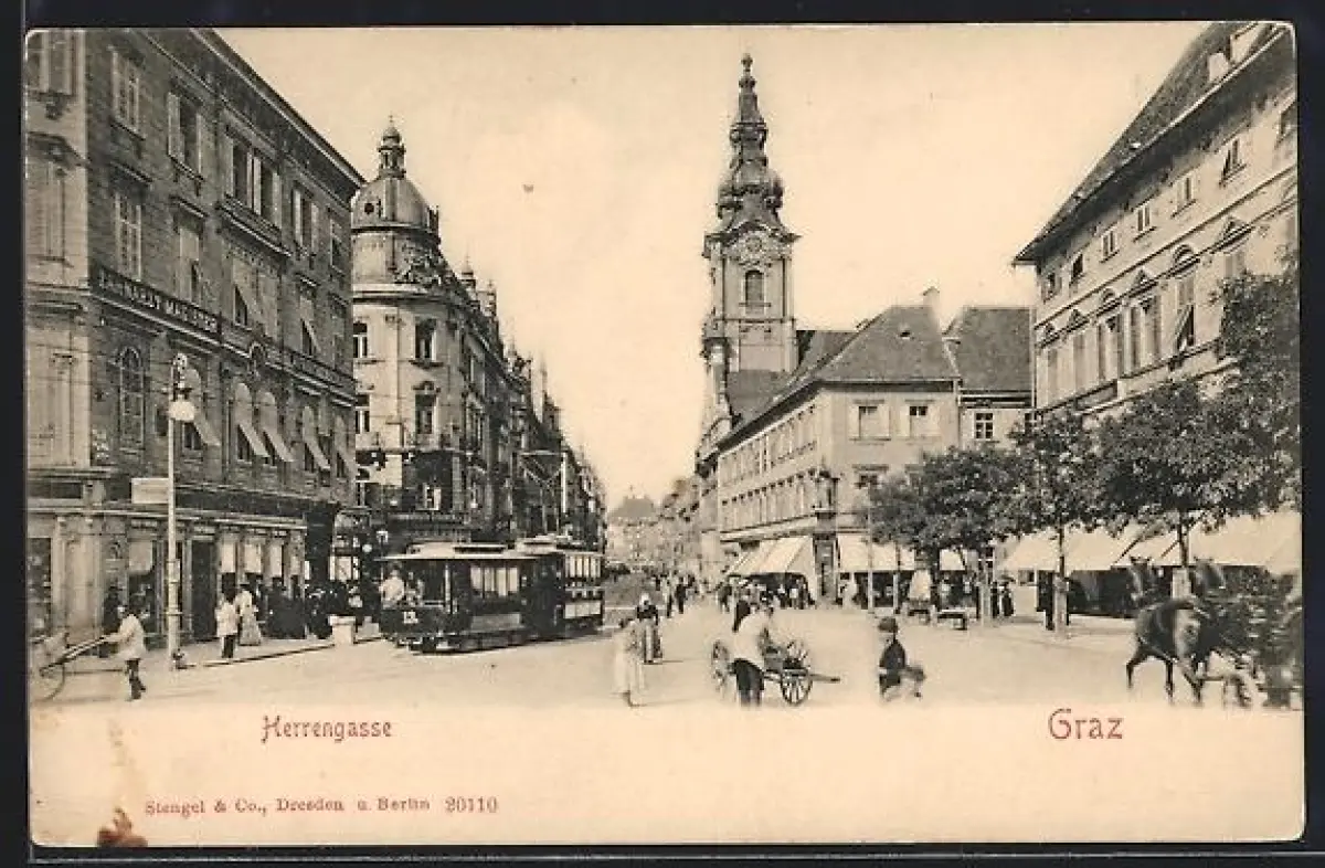 AK Graz, Strassenbahn in der Herrengasse, Pferdekutsche