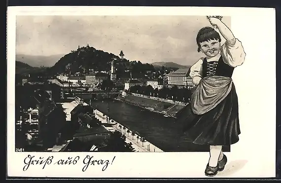 AK Graz, Uferpartie mit Brücke, Mädchen in Tracht