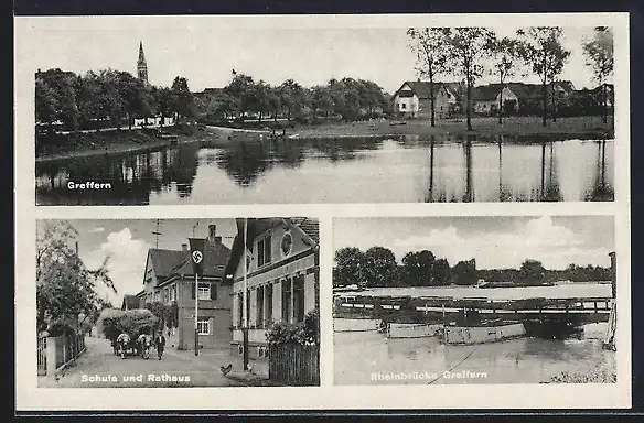 AK Greffern, Schule und Rathaus, Rheinbrücke, Totalansicht