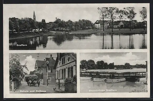 AK Greffern, Schule und Rathaus, Rheinbrücke, Uferpartie