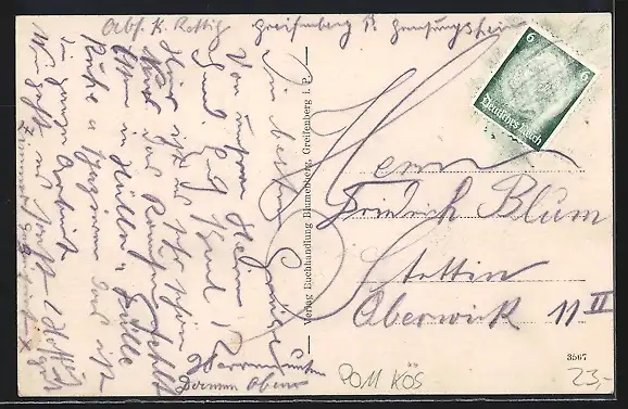 Personenbezogene Daten auf der Rückseite der Karte wurden durch blauen Textmarker unkenntlich gemacht. Die blauen Stellen sind auf die Vorderseite durchgeweicht und wirken sich negativ auf das Postkartenfoto aus