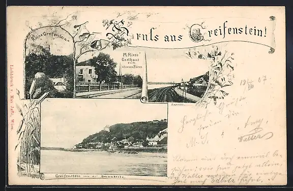 AK Greifenstein an der Donau, Gasthaus zum schwarzen Bären M. Riess, Ruine Greifenstein