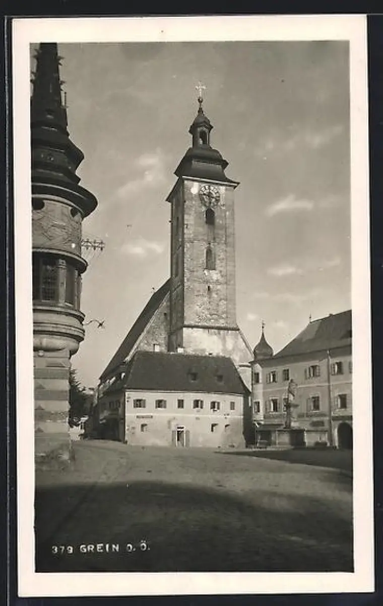 AK Grein /O. Ö., Strassenpartie mit Kirche, Gasthaus und Denkmal